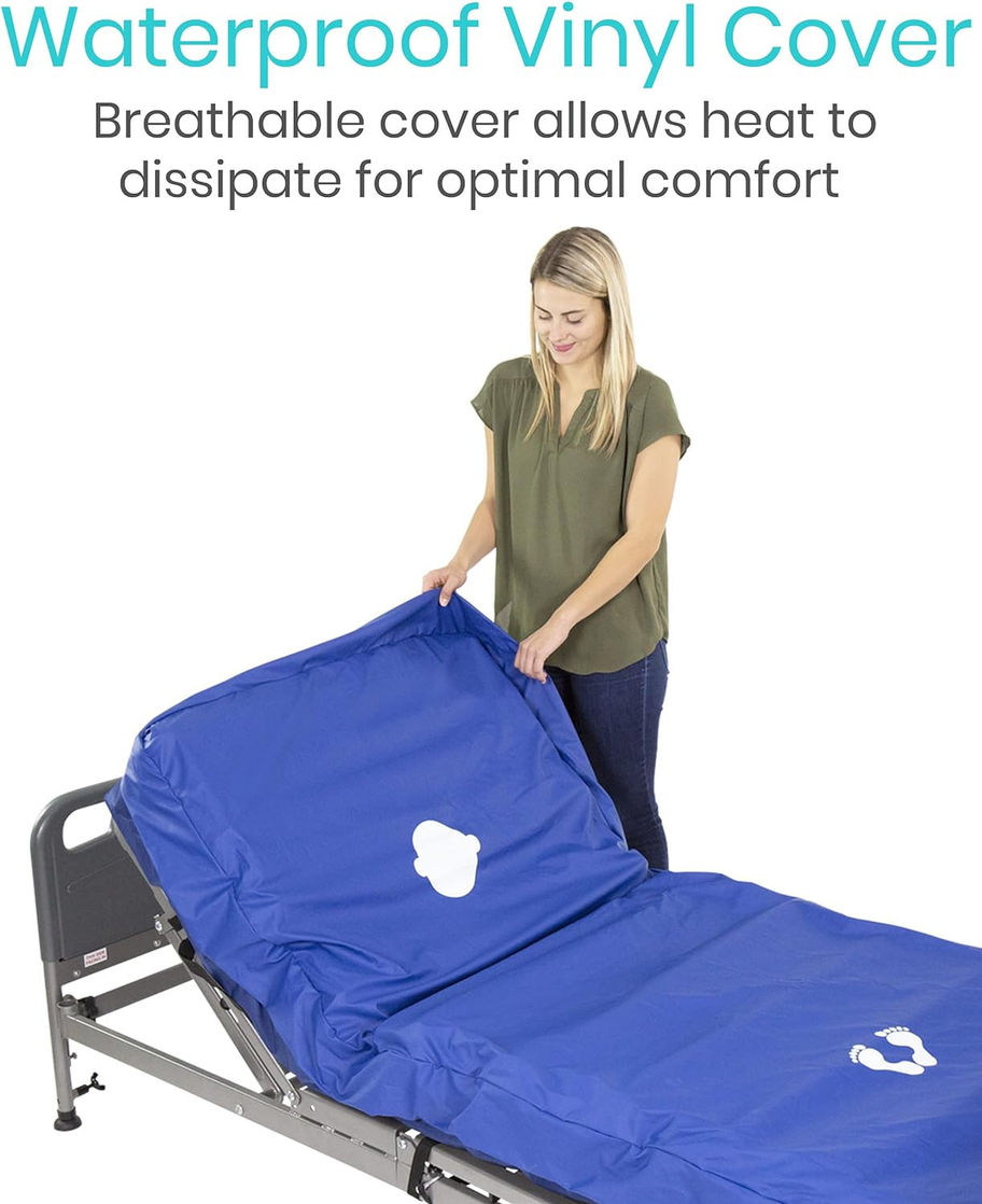 - WATERPROOF VINYL COVER: Protecting the pressure mattress, a waterproof vinyl cover easily slips over the air cells. The breathable cover allows heat to dissipate for patient comfort and is durably designed, supporting up to 350 pounds.