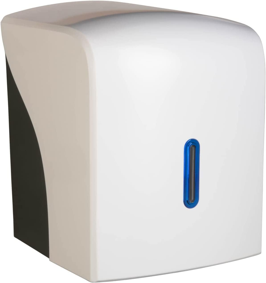 The lockable dispenser holds large roll of centre feed paper, which dispenses freely and consistently when pulled.
