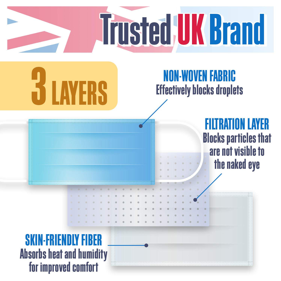 Each pack contains 50 blue non-medical face masks that are to be used to cover the nose and mouth and is intended for use in food preparation and other clean or sensitive environments such as beauty salons. The masks feature 3 layers of material. Ideal for general use including; dog walking, exercising, driving and supermarket shopping. The mask is easy and comfortable to wear, featuring an ear loop design to ensure it fits all faces with ease. It features 3 layers of material, intending to cover the nose and mouth.