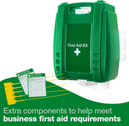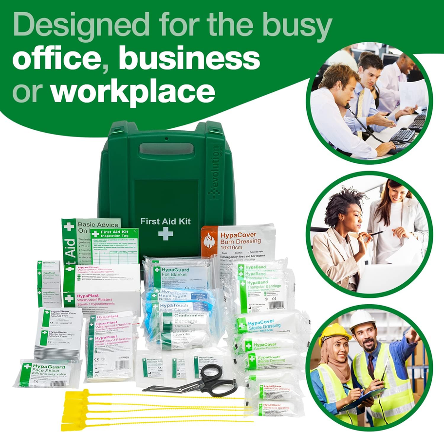 - Fully-stocked first aid kit from a leading UK manufacturer specifically designed for the busy office, kitchen, construction site or any other active workplace
