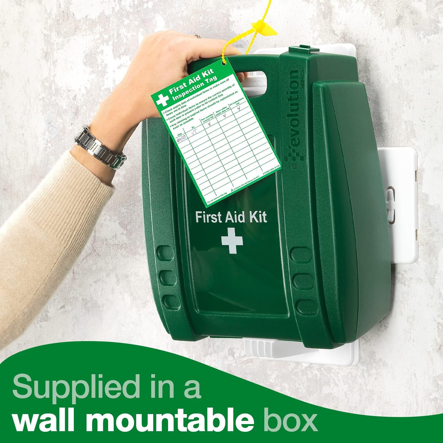 This kit has been carefully compiled with workplaces in mind to ensure that you have an easy-to-use first aid solution ready for emergencies. The wall bracket ensures your first aid kit is easily locatable, and includes a "First Aid Kit Missing" sign to alert you if the case is in use or missing. The portable and durable Evolution case protects first aid supplies from dust and moisture.