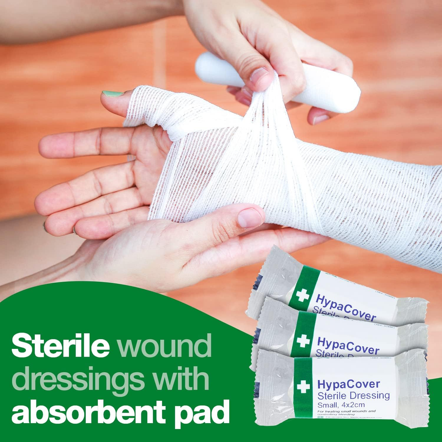 The HypaCover Sterile Dressing is a premium quality wound dressing made to meet HSE first aid recommendations and NHS standards. The individually wrapped dressings are an essential item for any well-stocked first aid kit, and are included in the list of required components for BS 8599-1 and BS 8599-2 compliant kits.