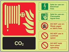 - Landscape Orientation. Sign reads "CO2. Safe For Use On Flammable Liquid Fires. Safe For Use On Electrical Fires. DO NOT Use On Wood, Paper or Fabric Fires. DO NOT Use In Confined Space."