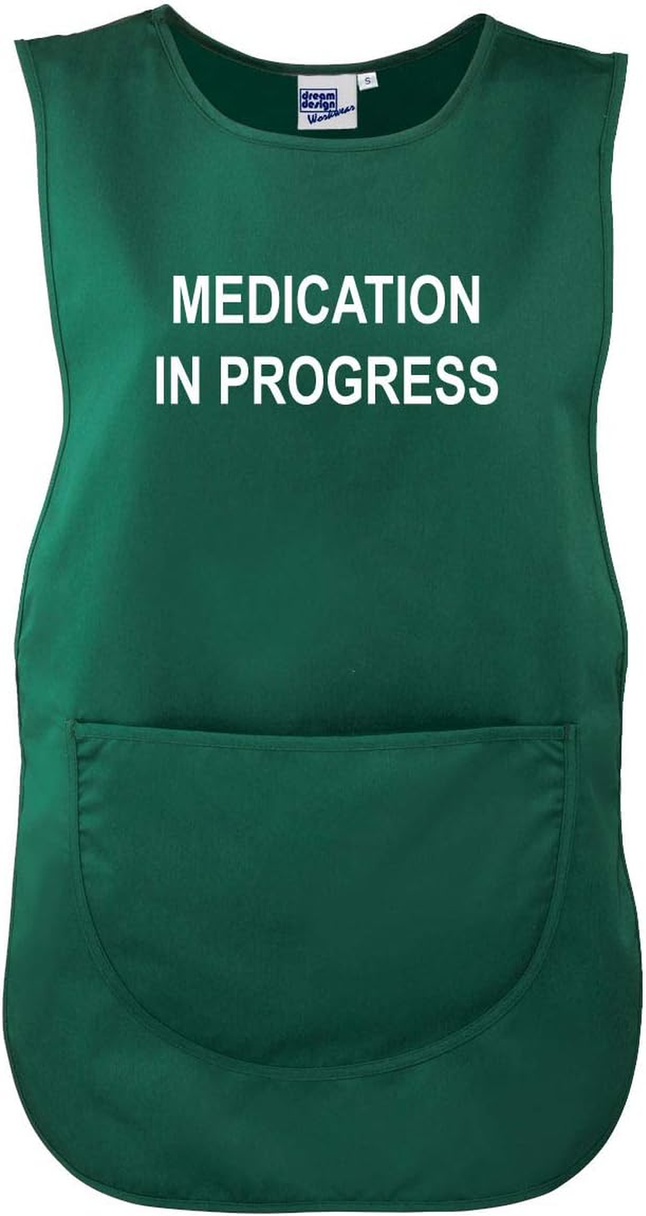 Workwear 'Medication In Progress' Front/Back Printed Text Medical Care Home Tabard. Ideal for use in medical environments, care homes etc. where staff are distributing medication and a clear warning to others is required. Features: Bright colours for easy visibility. Large, easy-to-read text in contrast Yellow colour. Printed back and front for ease of viewing from any angle. Front text reads in capital letters: MEDICATION IN PROGRESS. Rear text reads in capital letters: PLEASE DO NOT DISTURB. Durable and comfortable tabard. Front pocket, adjustable side stud fastening. Length 70cm approx. Sizes (chest to fit): S (32/34"), M (36/38"), L (40/42"), XL (44/46"), XXL (48/50"), 3XL (52/54"). Fabric: 65% Polyester, 35% Cotton twill, 195gsm. Colours: Red with Yellow print, Yellow with Red print, Bottle Green with White print.